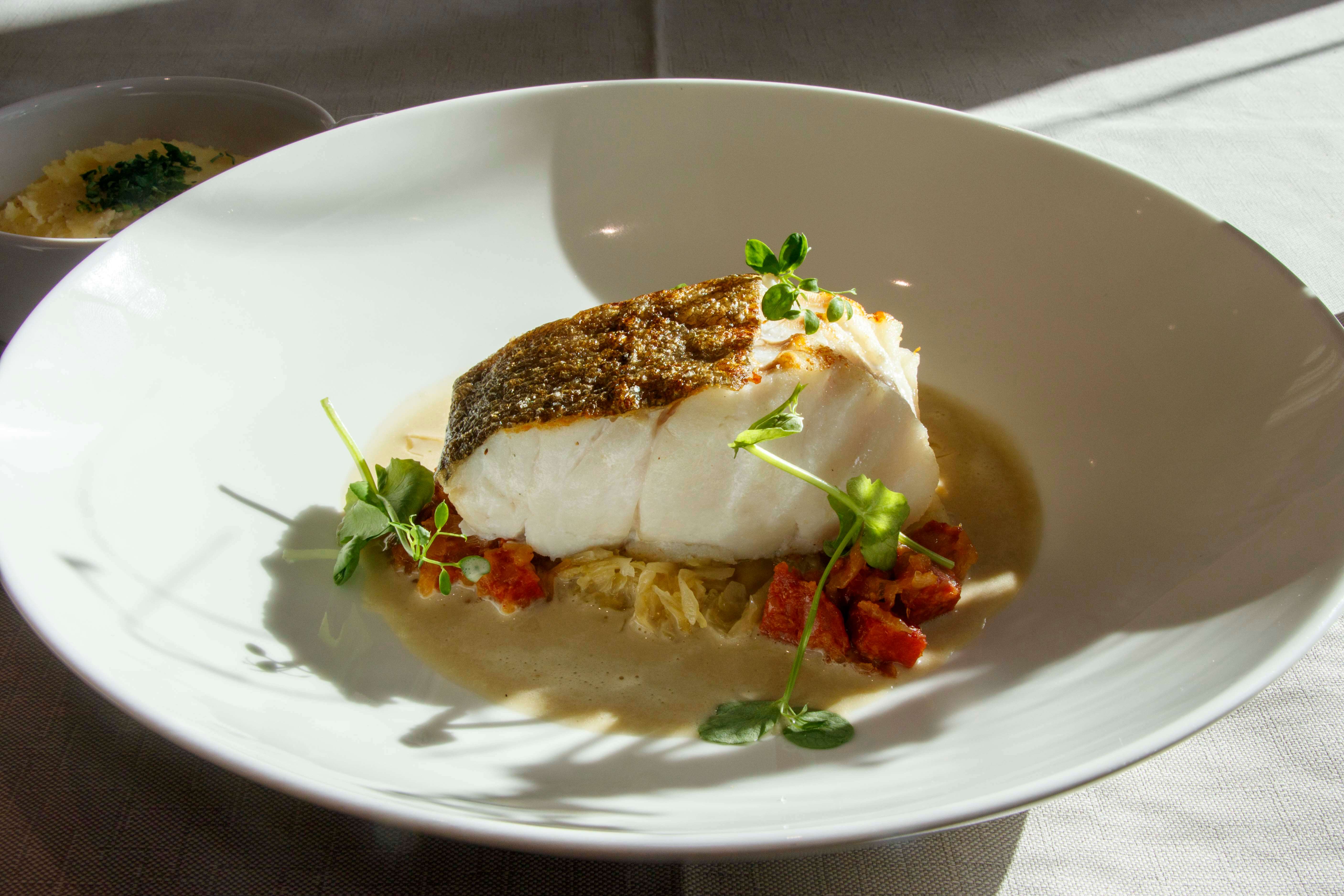 Coeur de cabillaud au chorizo & petite choucroute, mousseline de pommes de terre au beurre noisette & sauce vin blanc à l’estragon